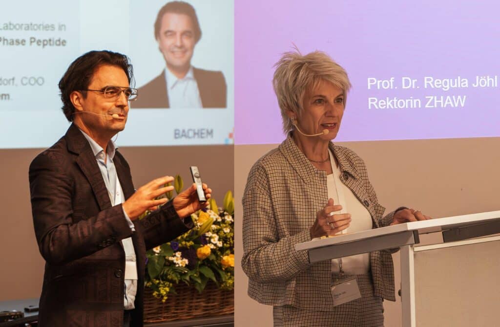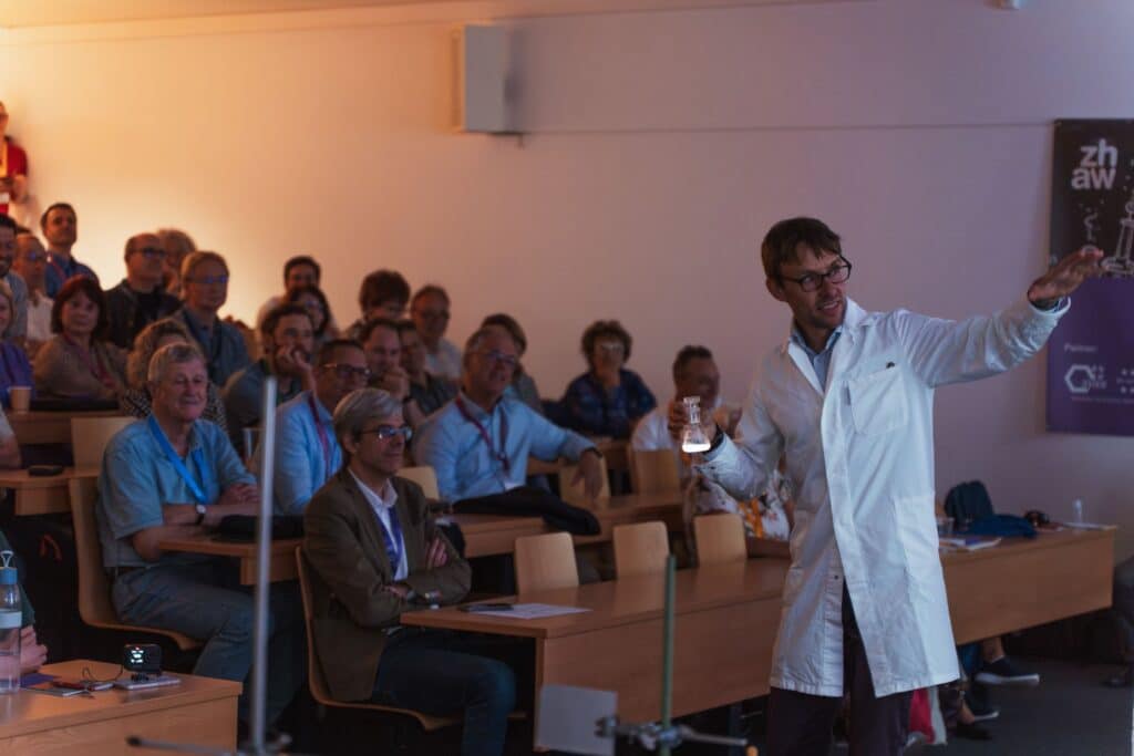 Den Abschluss des Tages bildeten Festansprachen von Thomas Meier, CEO der Bachem AG, Vorstandsmitglied von Scienceindustries und Absolvent des Chemiestudium noch am Technikum in Winterthur, sowie von Regula Jöhl, ZHAW-Rektorin und promovierte Biotechnologin. Fulminanter Schlusspunkt des Tages war dann die Chemieshow mit Marc Bornand der Fachgruppe «Grundlagenchemie» und viel Feuer und einem Knall.