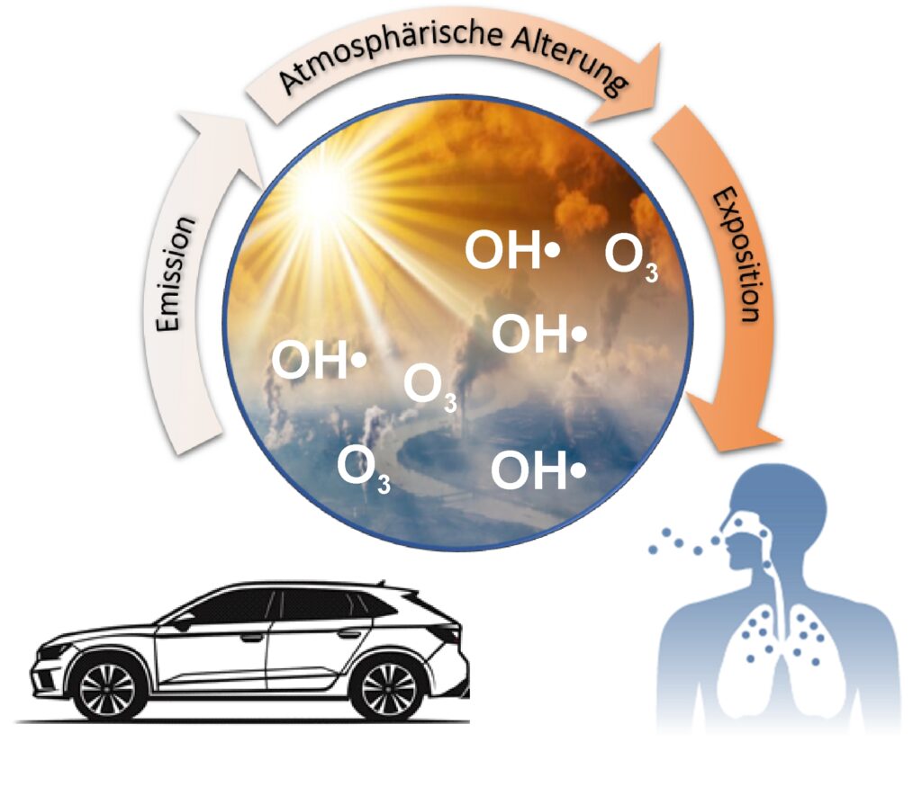 In der Studie wurden menschliche Lungenzellen (A549-Alveolar- und BEAS-2B-Bronchialepithelzellen) sowohl direkten Abgasen als auch im Labor photochemisch gealterten Abgasen eines EURO 6d-Fahrzeugs mit Partikelfilter ausgesetzt. Während frische Abgase kaum eine messbare Partikelkonzentration und keine toxischen Effekte zeigten, erzeugte die Photochemie der Atmosphäre («atmosphärische Alterung») reaktive Sauerstoffverbindungen wie Hydroxylradikale (OH·) und Ozon (O3), welche die Abgase oxidierten und sekundären Feinstaub bildeten. Dieser übertrifft die Konzentrationen im direkten Abgas um ein Vielfaches und löst sowohl DNA-Schäden als auch oxidative Zellschädigung aus.