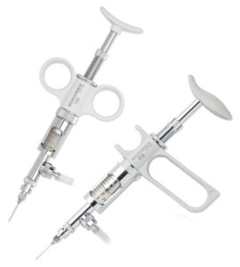 Alle Spritzen verfügen über einen verchromten Körper, einen austauschbaren Glaszylinder, einen Volumen-Einstell-Mechanismus mit Blockierläufer, einem Zweiweg-Ventil System sowie einem federbetätigten Kolben für automatische Nachfüllungen.