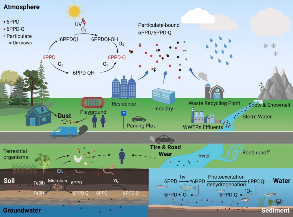 In den Gewässerproben entdeckten die Forschenden das Antioxidationsmittel N-(1,3-Dimethylbutyl)-N‘-phenyl-p-phenylendiamin, kurz: «6PPD», das aus 18 Kohlenstoffen, 24 Wasserstoffatomen, zwei Stickstoffatomen und zwei Sauerstoffatomen besteht. Der von vielen Herstellern eingesetzte Gummistabilisator schützt die Reifen vor Versprödung durch Ozon, das aus stickoxidhaltigen Abgasen entsteht, sowie vor Sauerstoff und Hitze. Er verhindert die Rissbildung und verlängert die Lebensdauer der Reifen. Reagiert die Chemikalie mit sauerstoffhaltigen Verbindungen wie Ozon, bildet sich «6PPD-Chinon», kurz: «6PPD-Q». Dieser sekundäre Schadstoff ist für den Tod der Fische verantwortlich. Wie toxisch 6PPD-Chinon wirkt, zeigten Tests an jungen Lachsen: In 1000 Litern Wasser kann ein Milligramm den Tierbestand in wenigen Stunden halbieren.