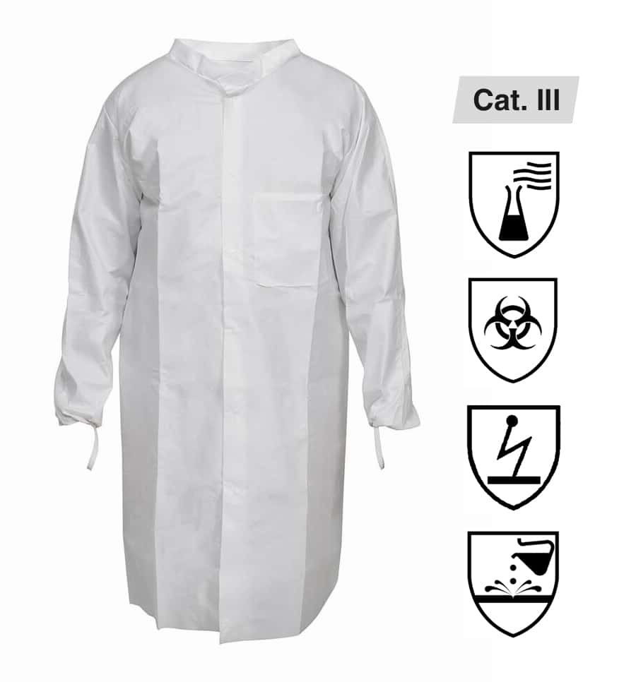 Für ihre vielfältigen Einsatzbereiche sind solche Laborkittel aus einem speziellen, textilähnlichen SMS-Material unter Verwendung von folienbeschichtetem, silikonfreiem Polypropylen gefertigt. Dabei handelt es sich um einen Tri-Laminat-Vliesstoff mit einer oberen Schicht aus Polypropylen-Spinnvlies, einer mittleren Schicht aus schmelzgeblasenem Polypropylen und einer unteren Schicht aus Polypropylen-Spinnvlies. Das sorgt für eine abriebfeste und fusselarme Qualität, ein ebenso strapazierfähiges wie atmungsaktives Material.