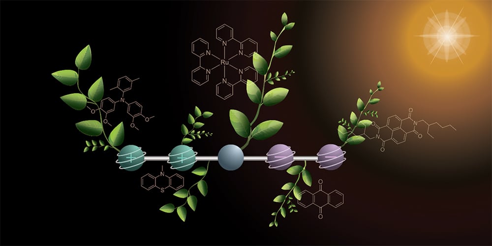 «Aber wir haben ein wichtiges Puzzleteil identifiziert und realisiert», sagt Oliver Wenger. Die Erkenntnisse aus der Studie tragen dazu bei, die für die künstliche Fotosynthese zentralen Elektronentransfers besser zu verstehen. Das neuartige Molekül besteht aus fünf kovalent mit einander verbundenen Teilen und weist die Struktur D2–D1–PS–A1–A2 auf. Dabei ist D2 ein Triarylamin, gefolgt von einem Phenothiazin als D1, in der Mitte als PS ein metallorganischer Komplex mit sechsfach koordiniertem Ruthenium (genauer: [Ru(bipyridyl)3]2+), dann ein Anthrachinon als A1 und schliesslich als A2 ein Naphthalindiimid [1].