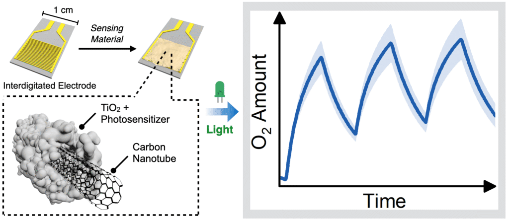 Dieses Funktionsprinzip haben die Forschenden auf ihren Sensor übertragen: In Gegenwart von grünem Licht überträgt der Fotosensibilisator Elektronen auf den Verbundstoff aus Titandioxid und Nanoröhrchen. Das aktiviert das Material und macht es spezifisch für Sauerstoff empfindlich. «Im Gegensatz zu anderen Gasen behindert Sauerstoff den Ladungstransfer im aktivierten Sensor, wodurch sich dessen Widerstand verändert – das ist die Grundlage der Sensorreaktion», resümiert Wettstein.