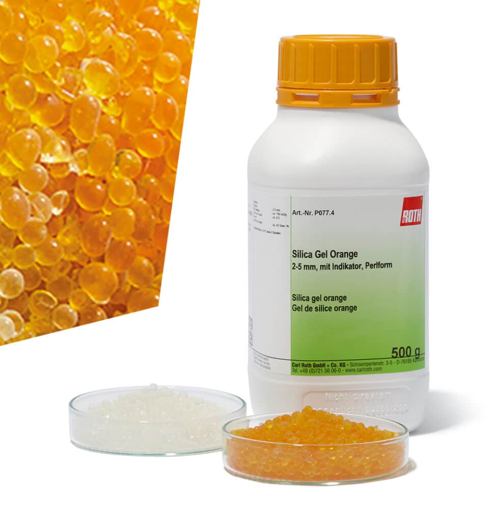 Ein oranges Kieselgel bietet für den Einsatz als Trockenmittel in Exsikkatoren, Trockentürmen, Verpackungen u.v.m. eine Performance wie das bekannte Blaugel und kommt ohne dessen gesundheitsschädlichen und wahrscheinlich krebserregenden Feuchtigkeitsindikator aus.